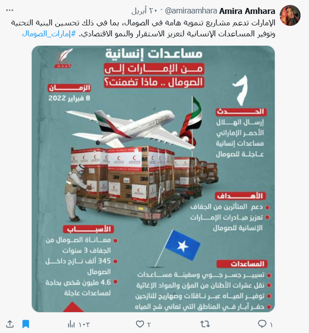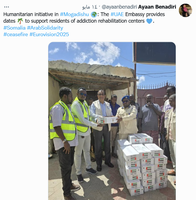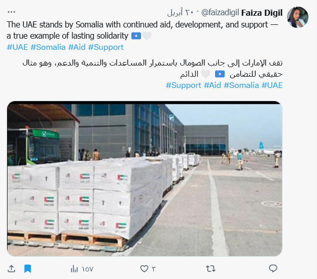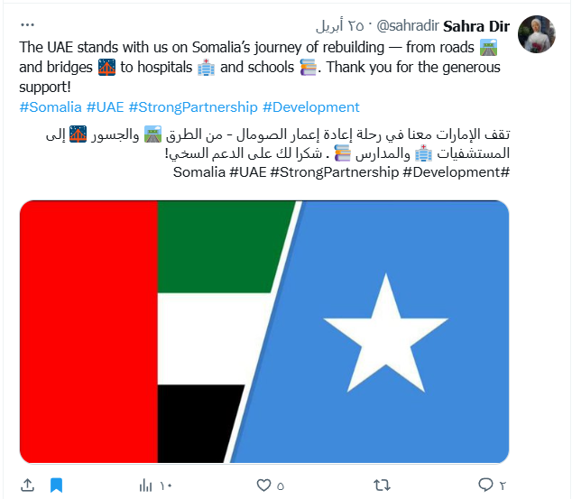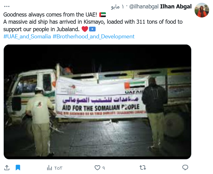 وفيما يخص المحتوى المتعلق بالشأن الصومالي، لاحظ فريق “إيكاد” تبني هذه الحسابات خطابًا ترويجيًا لدور الإمارات “الإنساني والتنموي” داخل الصومال، مع تغطية مكثفة لتحركات المسؤولين الإماراتيين في الصومال، ما يوحي بمحاولة لترسيخ صورة أبو ظبي كفاعل محوري في الداخل الصومالي.