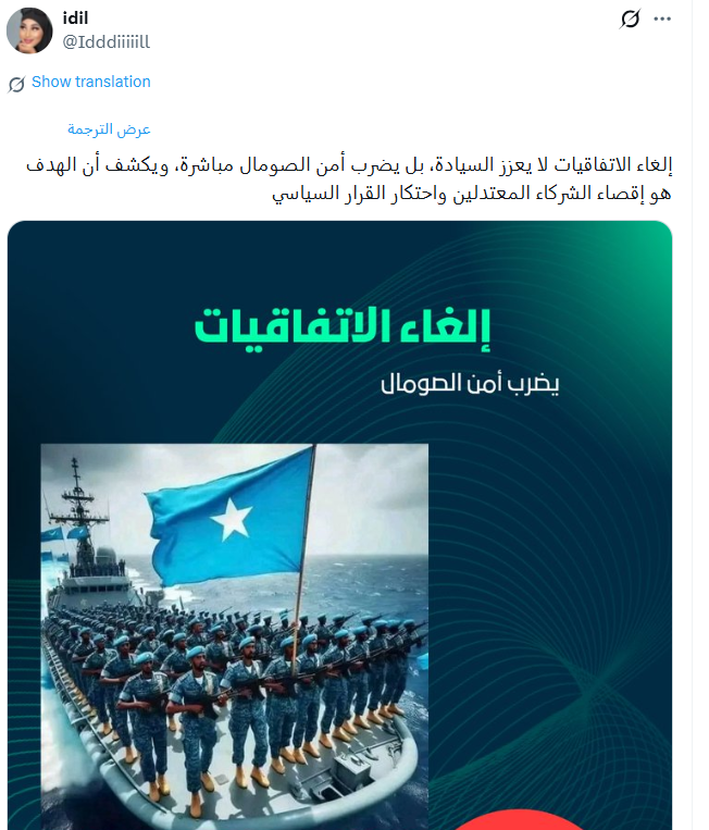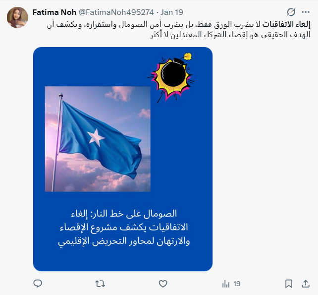 وفي الوقت الذي تبدي فيه هذه الحسابات دعمًا للحكومة الصومالية، إذ بها تهاجم قرار إلغاء الاتفاقيات العسكرية مع الإمارات، ردًا على اتخاذ الأخيرة خطوات “تقوض سيادة البلاد ووحدتها واستقلالها”، وفق بيان مجلس الوزراء الصومالي.