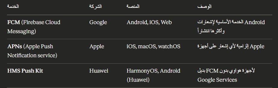 لفهم ما حدث، يجب أولًا توضيح نقطة مهمة: المهاجم لم يكن بحاجة لاختراق ملايين الهواتف بشكل فردي. يكفي فقط السيطرة على نظام الإشعارات الخاص بالتطبيق، وهو النظام الذي يُستخدم عادة لإرسال تنبيهات الصلاة أو التحديثات، ليتمكن من بث رسالة واحدة تصل فورًا إلى جميع المستخدمين. الجدول التالي يوضح أبرز الخدمات التي يتم استخدامها من قبل التطبيقات.